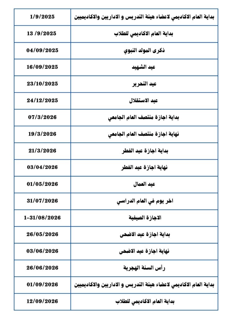 التقويم الأكاديمي للعام الاكاديمي 2025 / 2026
